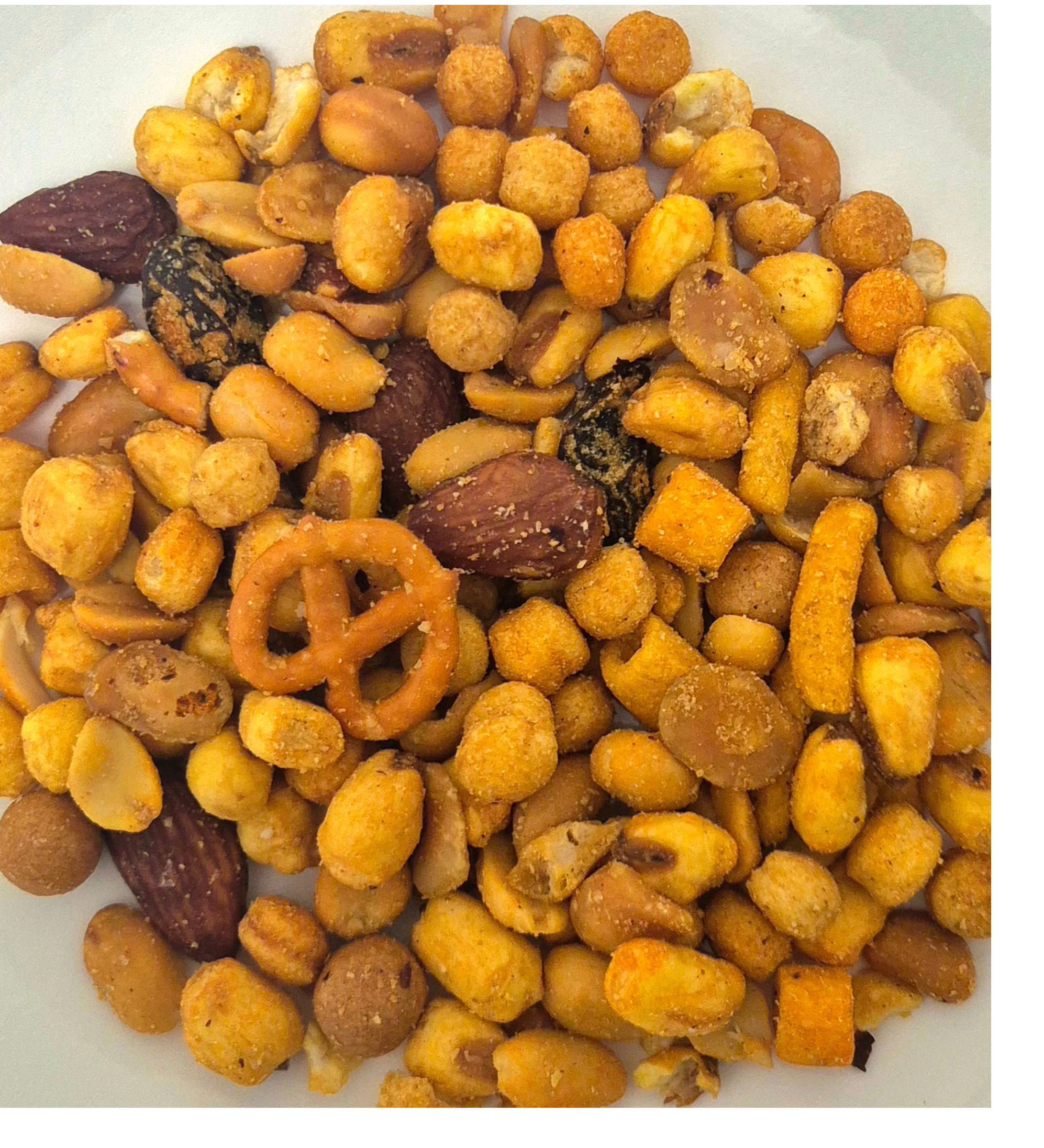 Maíz tostado, maní, pasas, habas, pretzel, garbanzos, semillas de maravilla, semillas de zapallo, almendras, avellanas, castañas de cajú, nueces y sésamo.