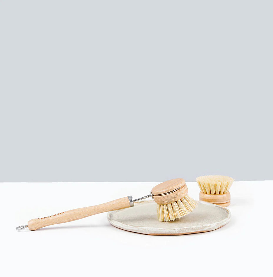Set ecológico para lavar loza que incluye un cepillo de mango de bambú con cerdas de sisal, junto con un recambio de escobilla. Diseño desmontable que te permite reutilizar el mango y reemplazar solo la parte de desgaste, lo que reduce residuos plásticos y prolonga la vida útil del utensilio. Ideal para quienes buscan productos más sustentables en la cocina.